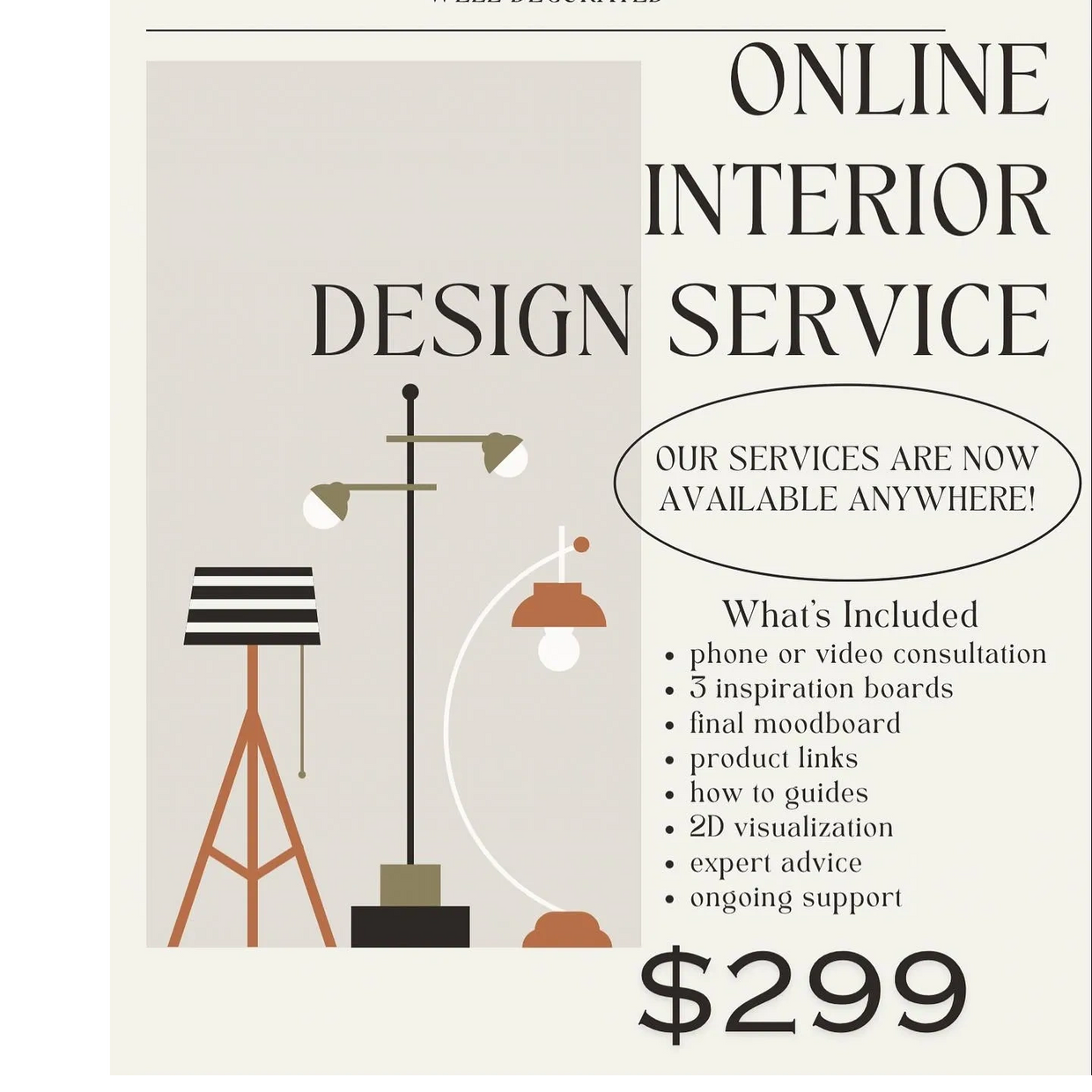 Well Decorated is a dynamic interior design company offering E-Design services, offering a seamless and personalized design experience entirely online. Whether you're looking to refresh a single room or transform your entire home, Well Decorated brings professional design expertise directly to you, no matter where you're located. With a focus on understanding your unique style and needs, our team creates custom design plans that are both functional and beautiful. Through detailed visual concepts, shopping lists, and layout recommendations, we ensure that your space reflects your personality and lifestyle, all while maintaining a high level of convenience and accessibility. At Well Decorated, we make the design process easy, affordable, and tailored to your tastes—delivered to your door with a click.